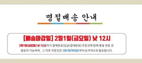 배송 | 설 명절 배송 마감 안내 입니다. 페이지 정보 작성자 깨사랑 작성일19-01-31 22:22 조회6,467회 댓글0건 관련링크 이전글 다음글 목록 본문 안녕하세요. 깨사랑 입니다. 2019년2월1일(금요일) 13시 주문건 까지는 2월1일에 발송 해드리고 그이후 주문건은 2월7일(목요일)이후 순차 발송해드립니다. 궁금하신점은 깨사랑 T 1588-8678 문의주세요 댓글목록 등록된 댓글이 없습니다. 이전글 다음글 목록