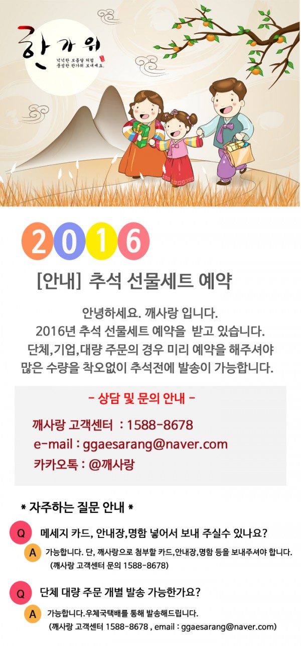 공지 | 2016년 추석 선물세트 예약 안내 입니다. 페이지 정보 작성자 깨사랑 작성일16-08-04 21:20 조회5,748회 댓글0건 관련링크 이전글 다음글 목록 본문 문의 깨사랑 고객센터 : 1588-8678 이메일: ggaesarang@naver.com 카카오톡 : @깨사랑 깨사랑 본사 및 공장 : 경기도 의정부시 부용로 219번길45,107 댓글목록 등록된 댓글이 없습니다. 이전글 다음글 목록