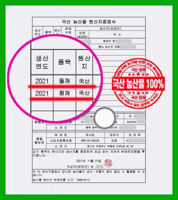 2021년 국산 참깨 및 들깨의 원산지 증명서 첨부 합니다.